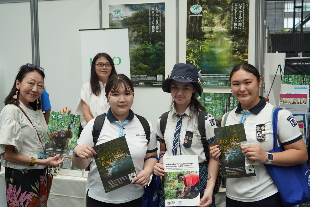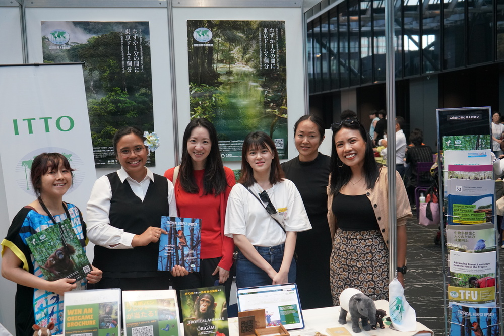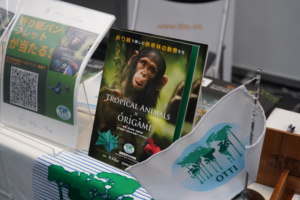 Los visitantes del stand de la OIMT recibieron información sobre la labor de la Organización en materia de gestión forestal sostenible y conservación de la biodiversidad. Se les invitó a participar en un concurso para ganar el libro Tropical Animals Origami (Origami de animales tropicales) de la OIMT, elaborado en colaboración con la ciudad de Yokohama, el Círculo de Origami de la Universidad de Tokio y Zoorasia
