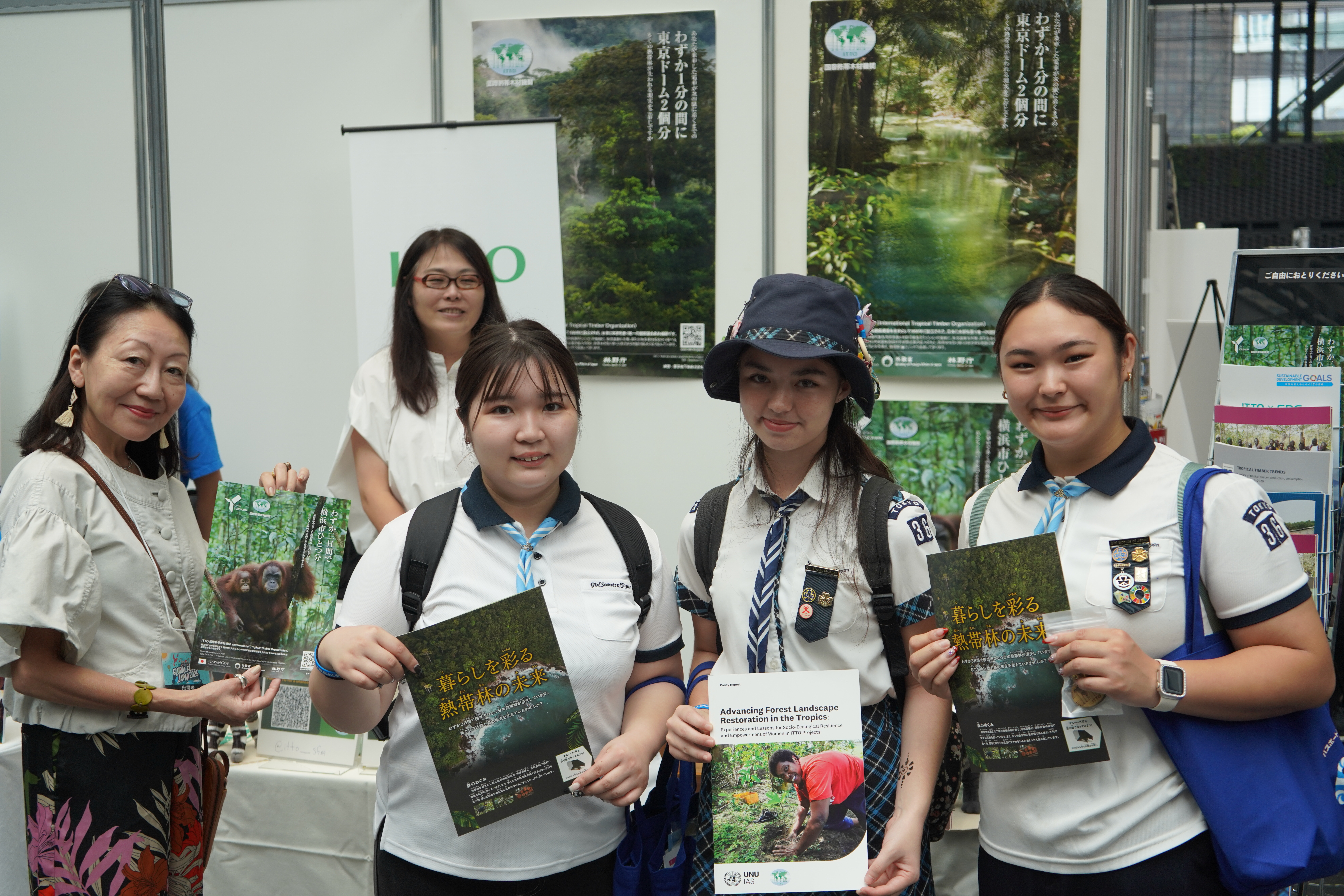 Miembros del personal de la OIMT con visitantes del stand de la Organización en la Global Festa Japan, el 27 de septiembre de 2025. © Mitch St.Hilaire/OIMT