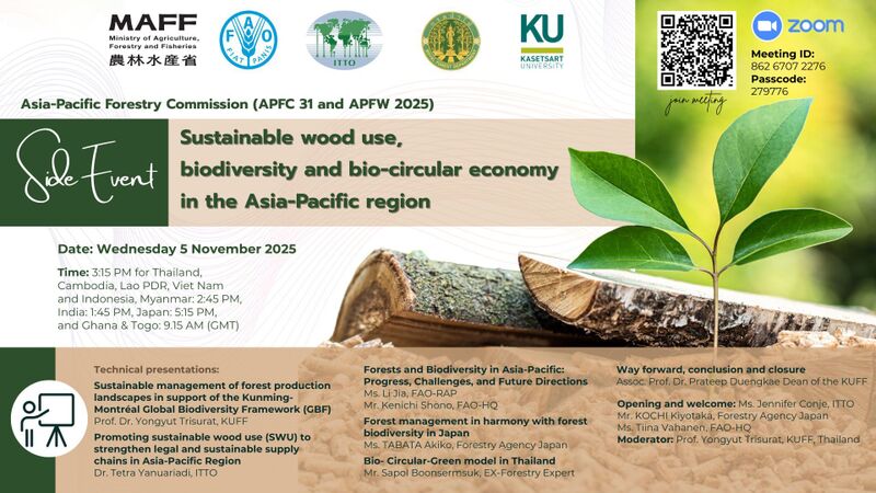Join ITTO, the Food and Agriculture Organization of the United Nations (FAO) , the Ministry of Agriculture, Forestry and Fisheries of Japa (MAFF), the Royal Forest Department of Thailand and Kasetsart University for a side event held during Asia-Pacific Forestry Week 2025 (APFW2025).