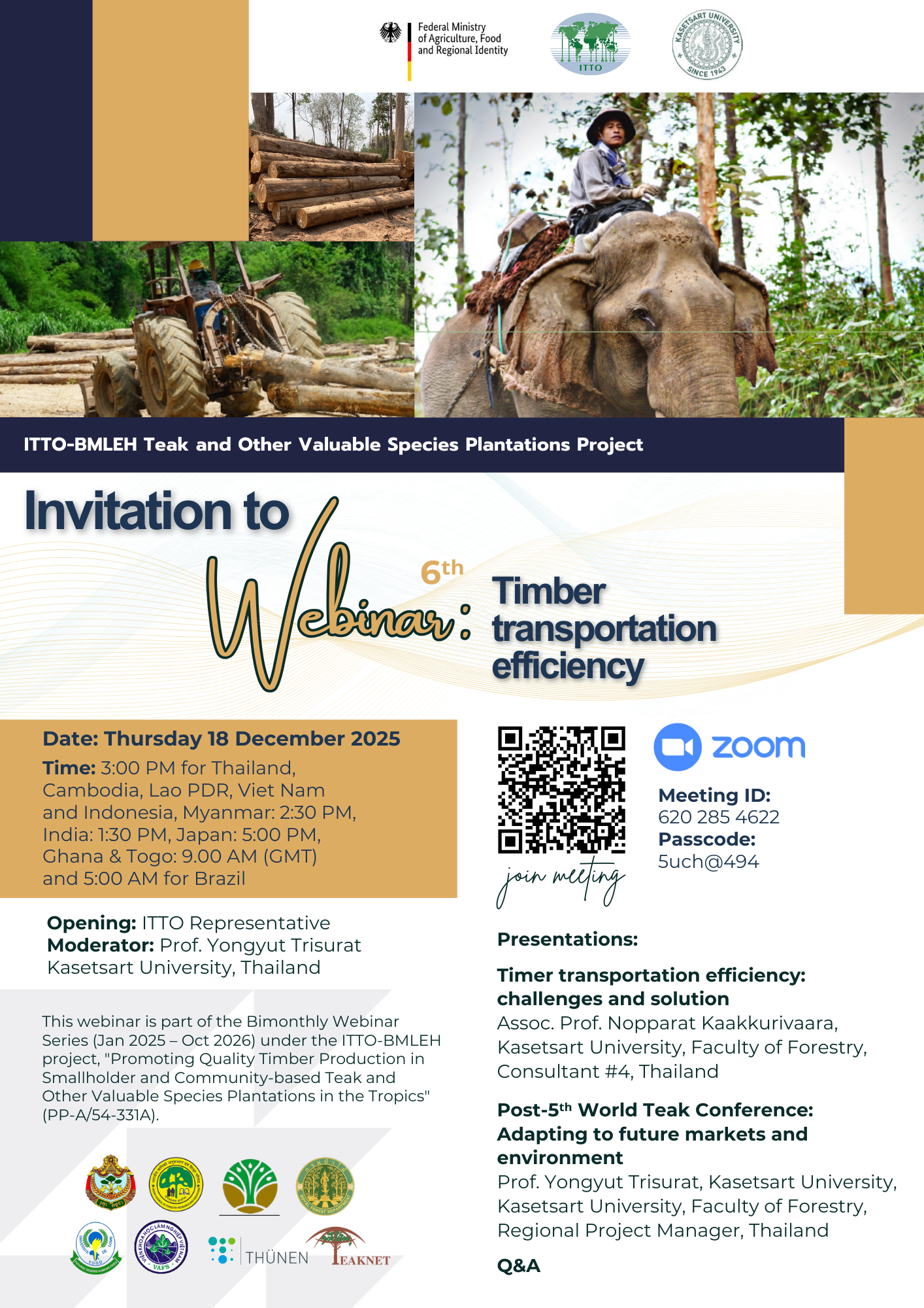 Ce webinaire s’inscrit dans la série de webinaires bimestriels (janvier 2025-octobre 2026) organisée dans le cadre du projet OIBT-BMLEH «Promouvoir la production de bois de qualité dans les plantations de teck et autre essences forestières précieuses appartenant à des petits exploitants et des communautés en région tropicale (PP-A/54-331A).