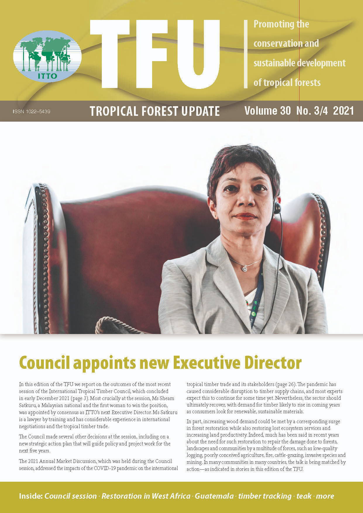 Dans ce numéro de TFU, nous dressons le bilan de la récente session du Conseil international des bois tropicaux, qui s’est close au début de décembre 2021. Fait le plus marquant de cette session, Mme Sheam Satkuru, ressortissante malaisienne et première femme à remporter ce poste, a été