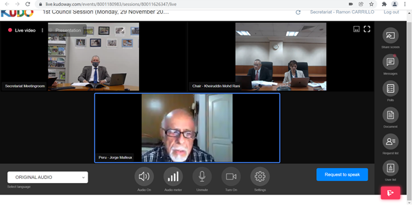 さらに、次期ITTO事務局長最終候補者3名による各15分間のプレゼンテーションが行われました。この3名は、シャーム・サックル氏(マレーシア)、フランシスコ・ソウザ氏(ブラジル)、ユーリ・タムリン氏(インドネシア)です。理事会は今会期中に最終選考を行い、2021年12月3日(金)に新事務局長を決定する予定です。